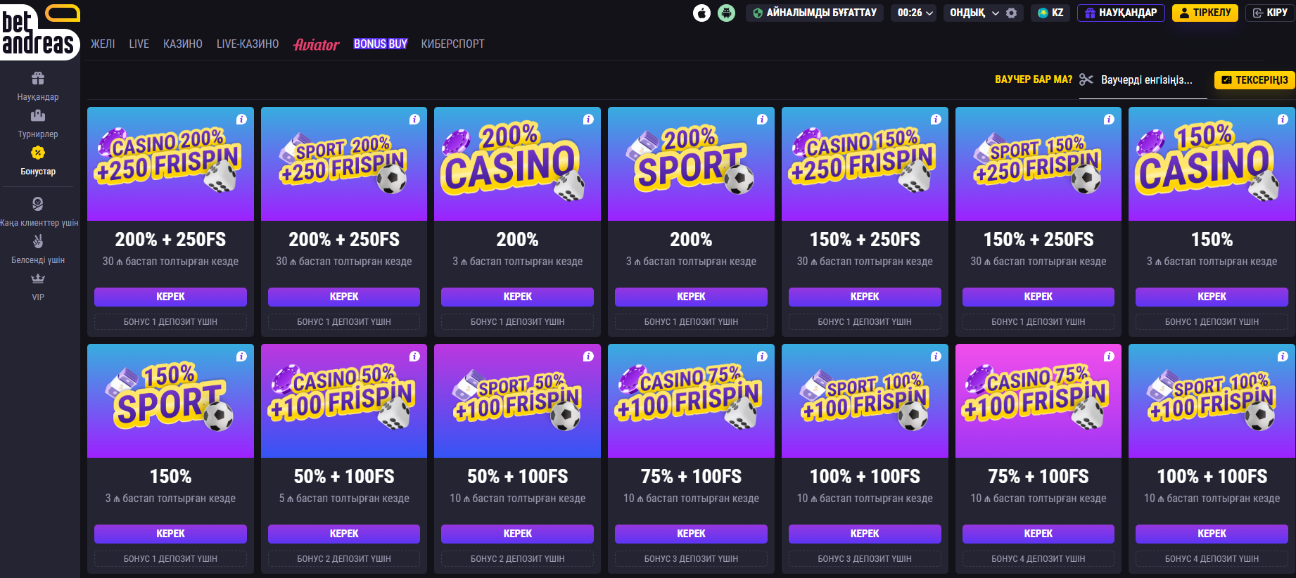 - Тұрақты бонустар және эксклюзивті Betandreas промокодтары;